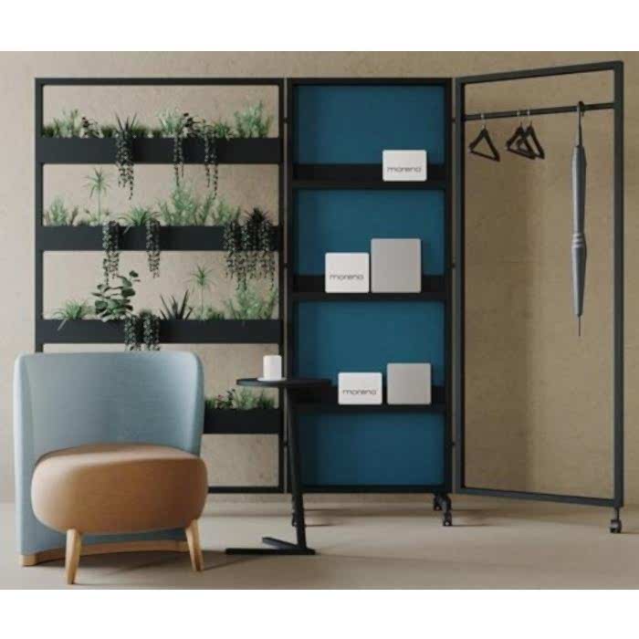 Metal saksılar, kitaplıklar, askılıklı, döşemeli ve raflı panellerinin kombinasyonu. Frenli tekerleklere sahip olduklarından, herhangi bir çalışma alanında işlevselliği ve mahremiyeti artırmak için kolaylıkla hareket ettirilebilirler.Akustik kumaşla kaplanmış olup mükemmel ses yalıtımı sağlar. İşlevselliğini artırmak için diğer panellerle birleştirilebilir.